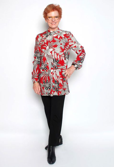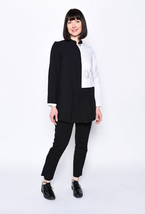 This semi-fitted tunic features front-concealed placket, front peplum skirt with soft pleats, side vents, band collar and long sleeves with bound placket and narrow, lapped bands.