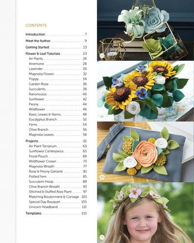 - Beautiful felt projects including a floral garland, decorative pillow, potted plant, Bohemian crown, terrarium and more!